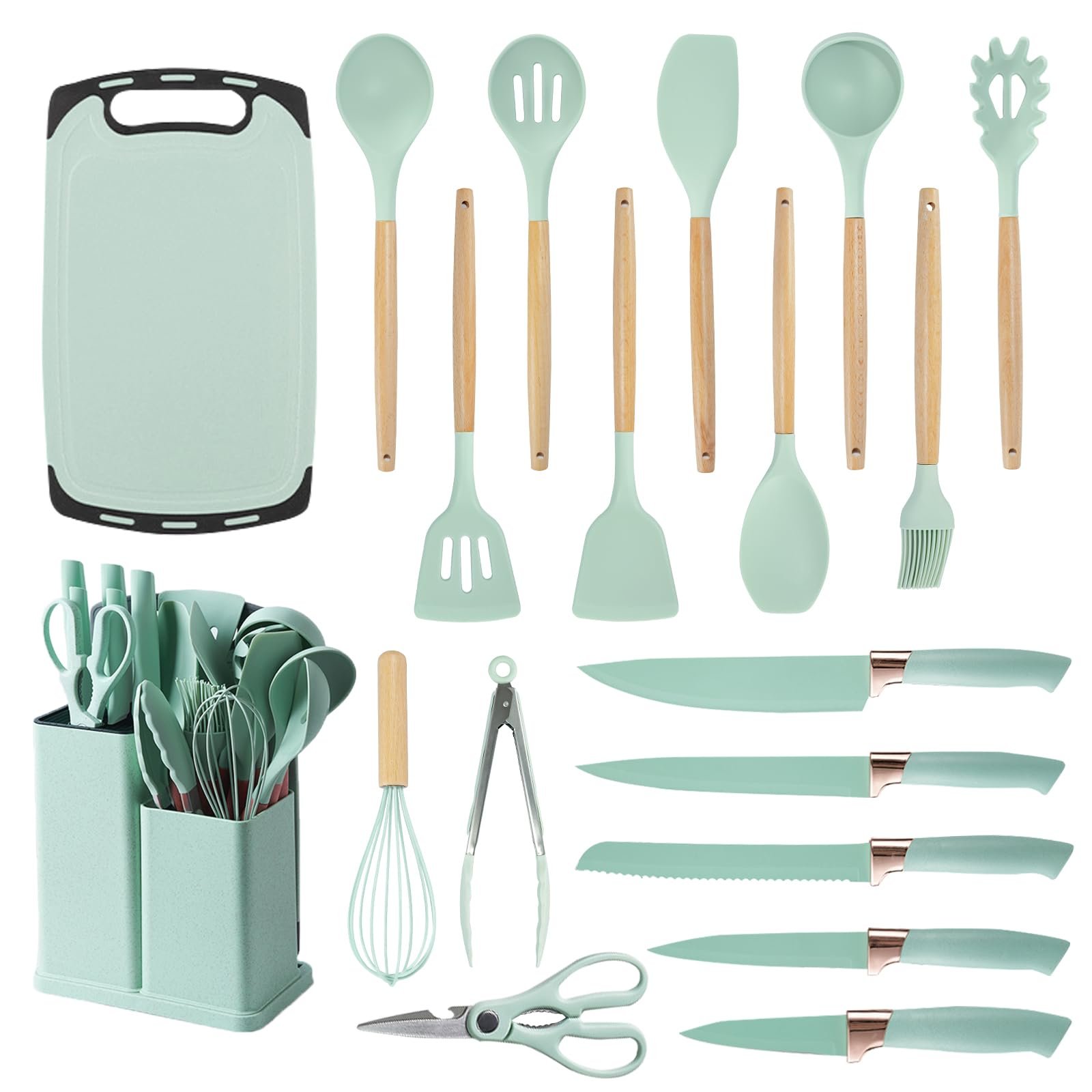 19-Piece Premium Silicone Kitchen Utensil Set with Wooden Handles, Cutting Board & Storage Bucket